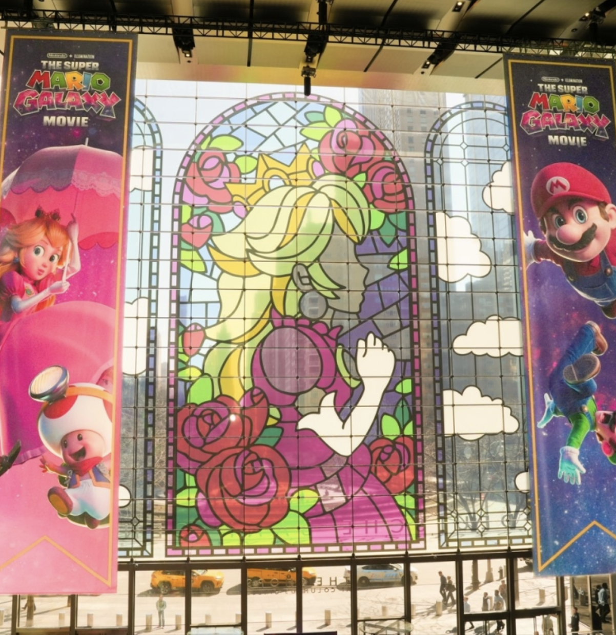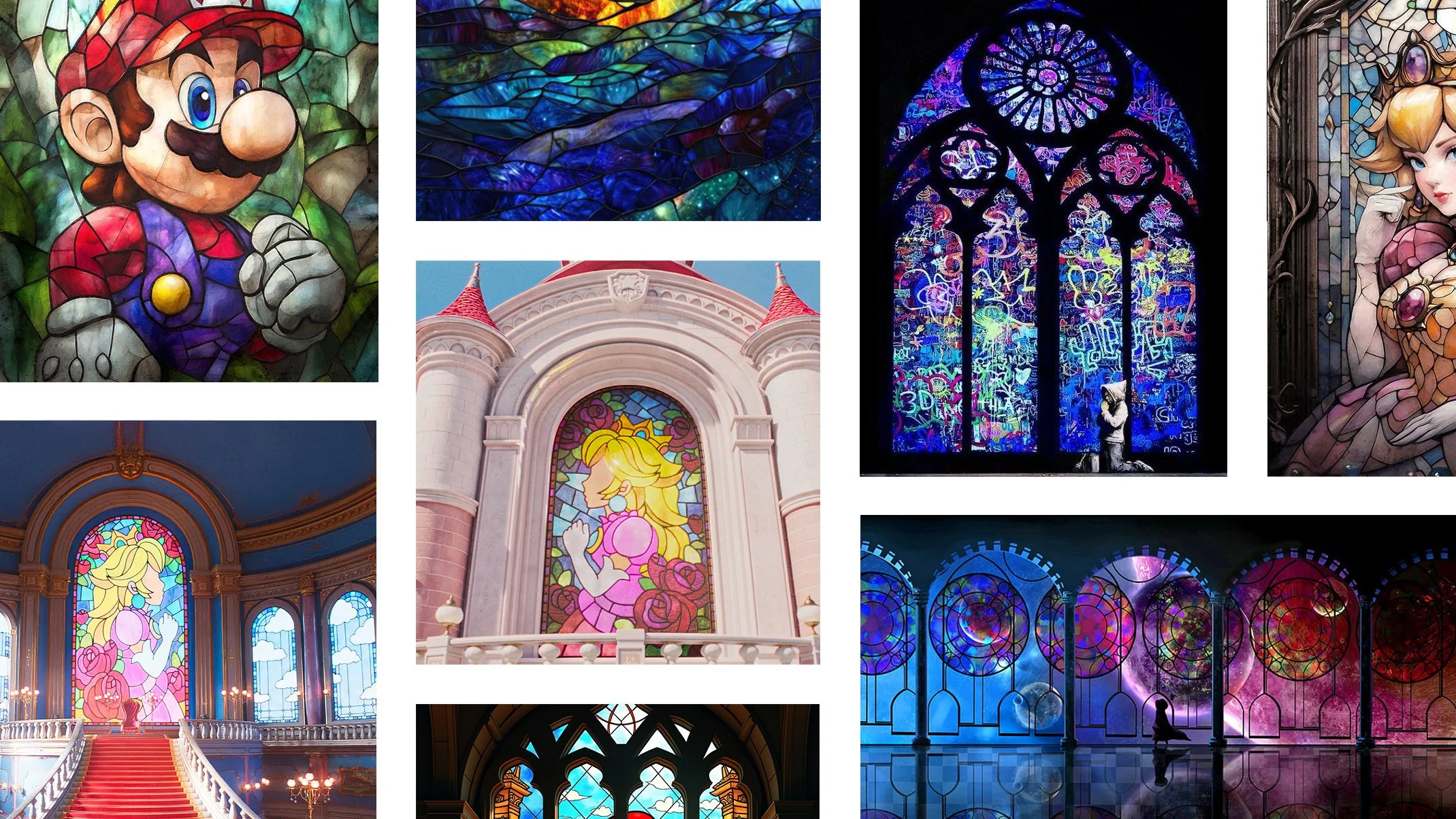 A cinematic stained-glass installation transforming the space into a radiant tribute to the universe of Super Mario Galaxy. Each panel acts as a heroic vignette, spotlighting iconic characters in moments of triumph, motion, and discovery.